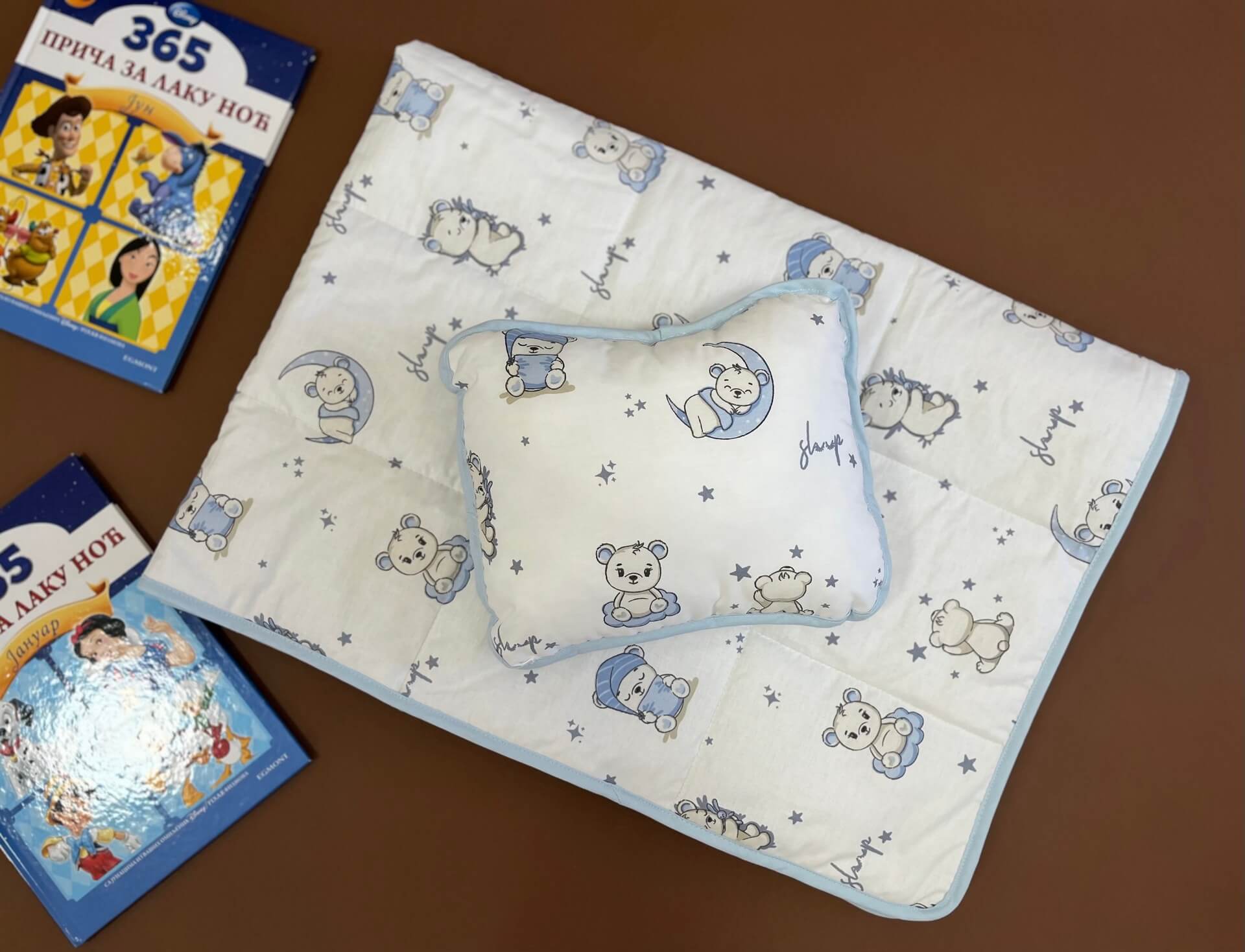 Set se sastoji od ogradice sa dvije strane, jastuk, navlaka za jastuk, jorgan, navlaka za jorgan, čaršav na gumu i ukrasna mašna.
