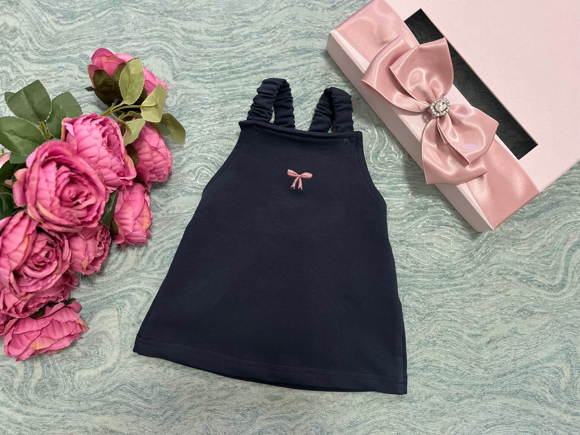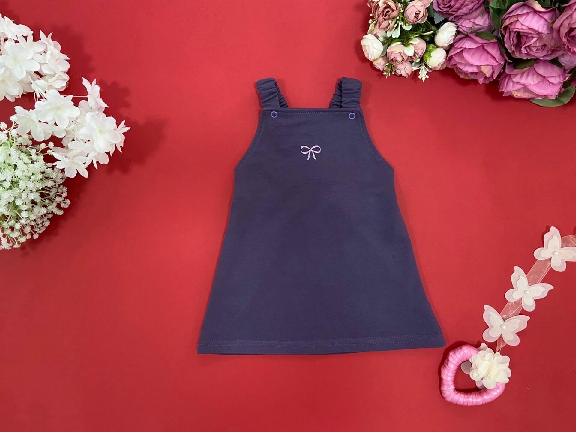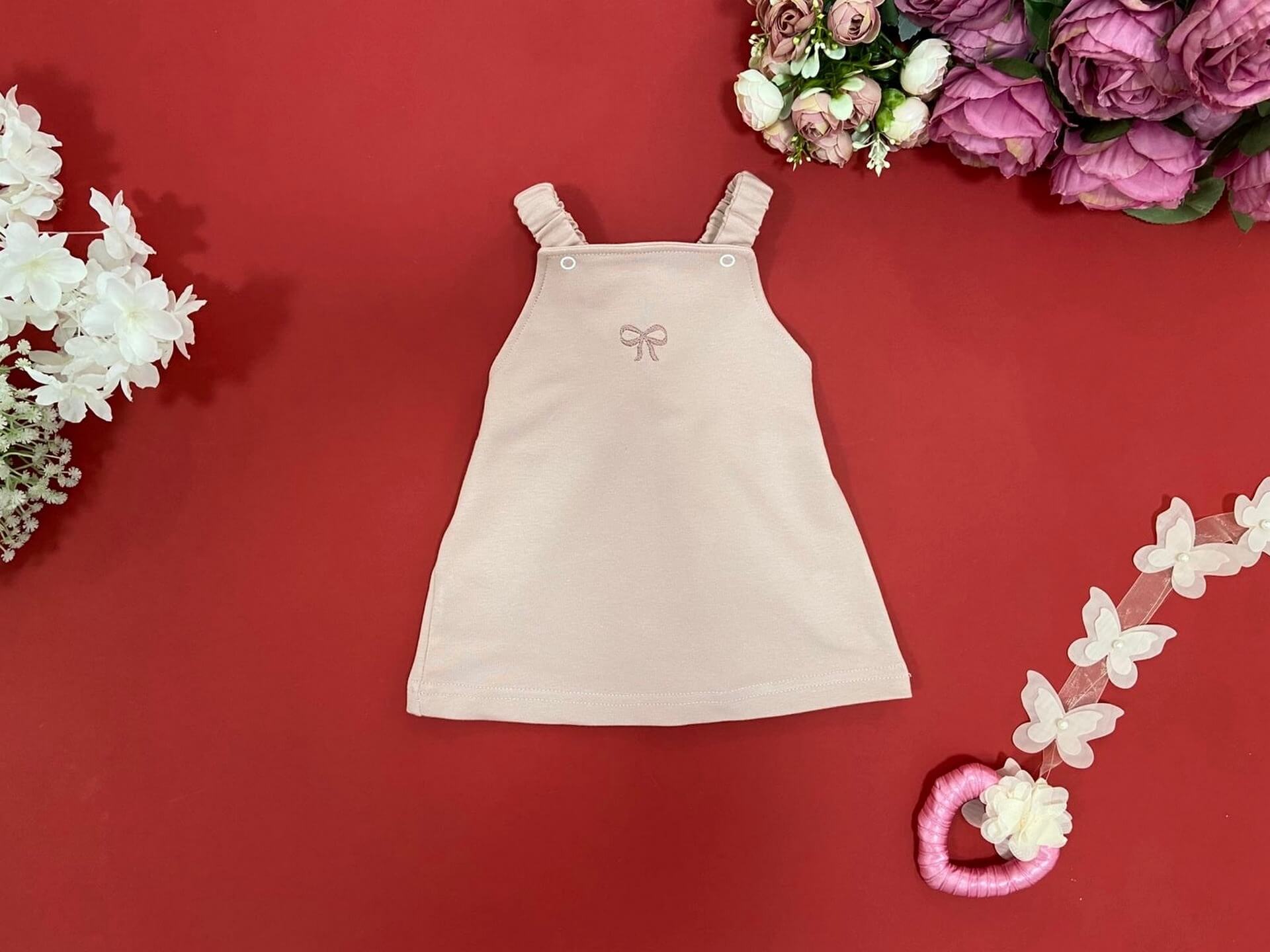 Haljinica za djevojčice na tregere sa nježno izvezenom mašnicom. Udobna, lagana i idealna za kombinovanje uz bodi ili majicu – savršena za vrtić, šetnje i posebne prilike.