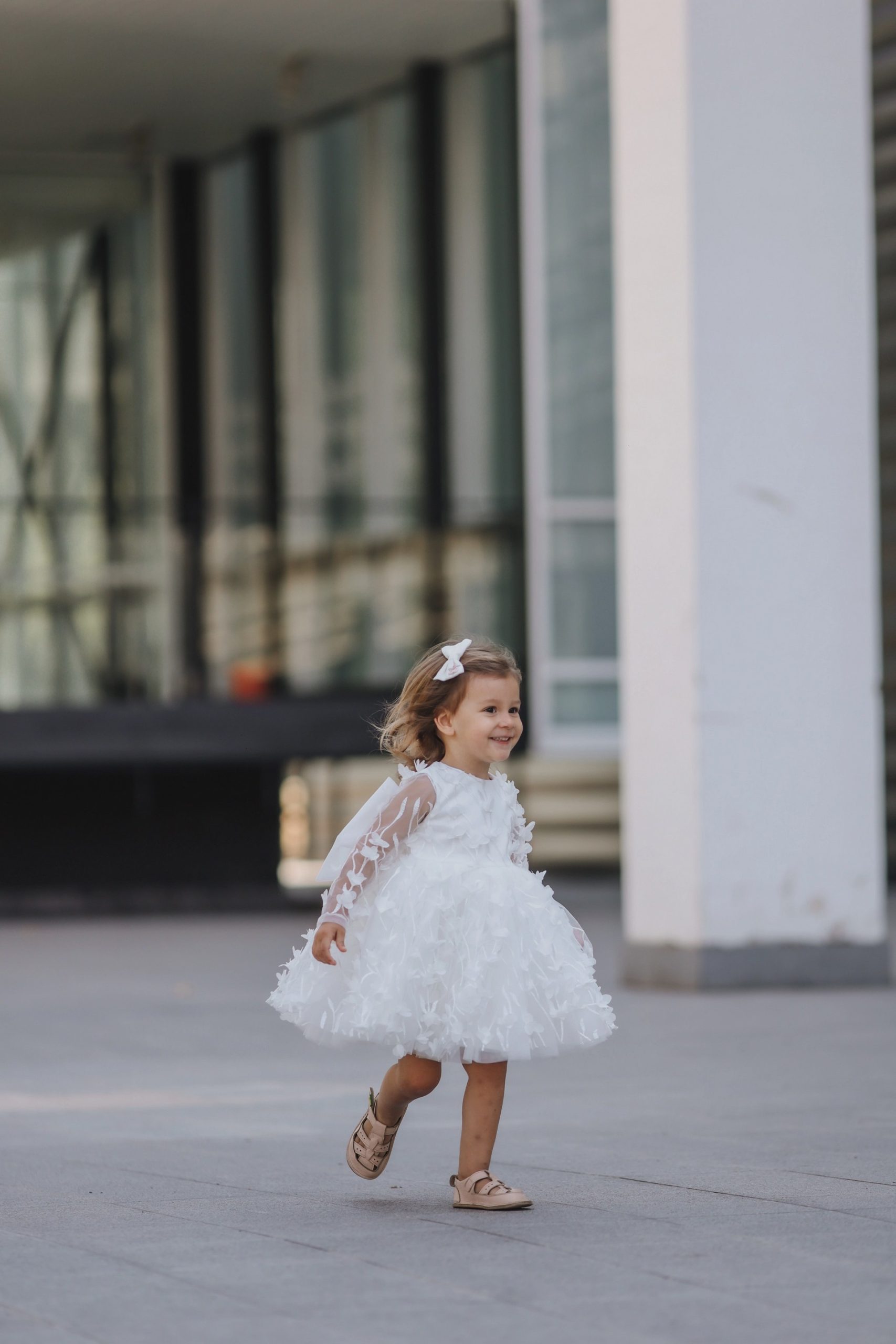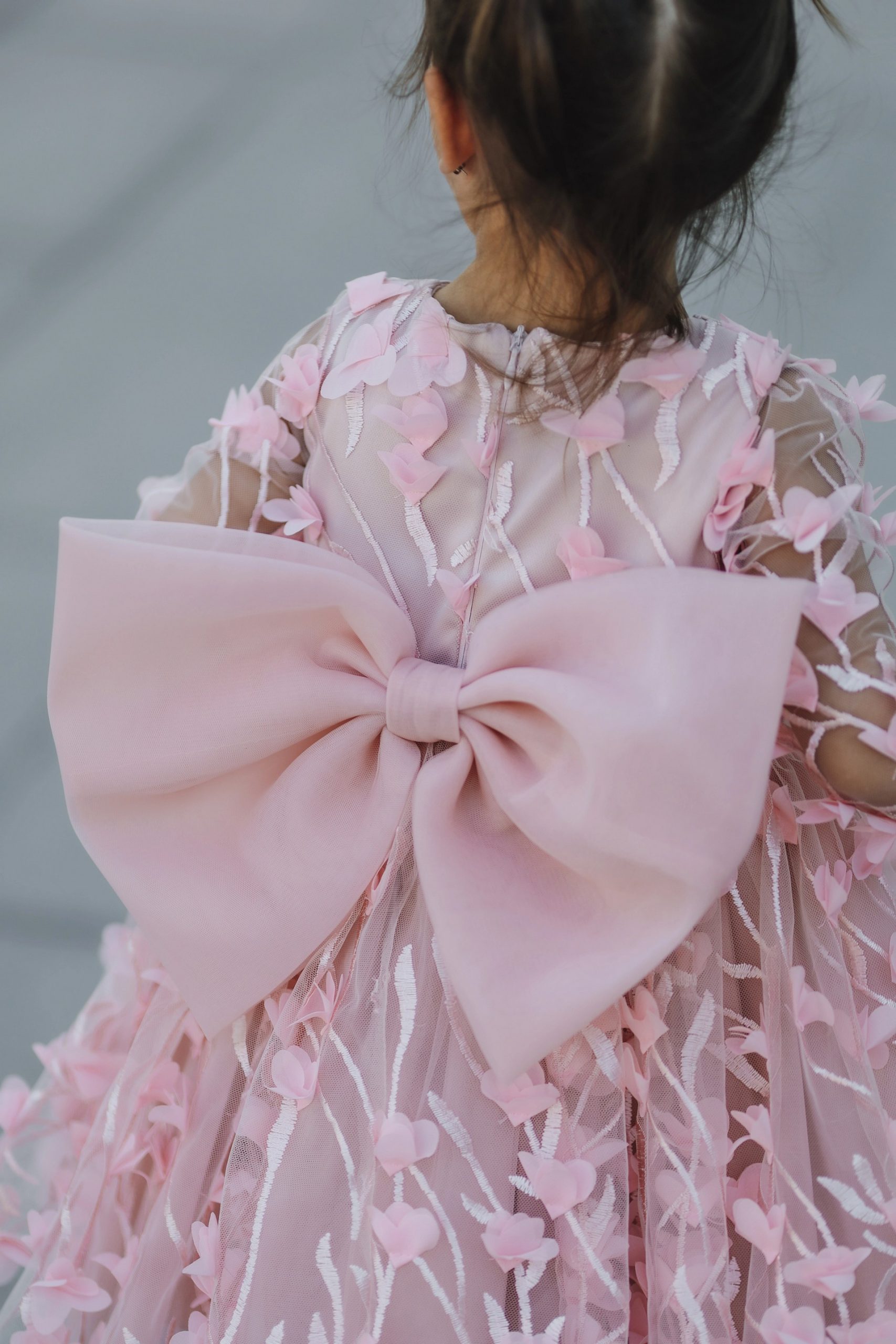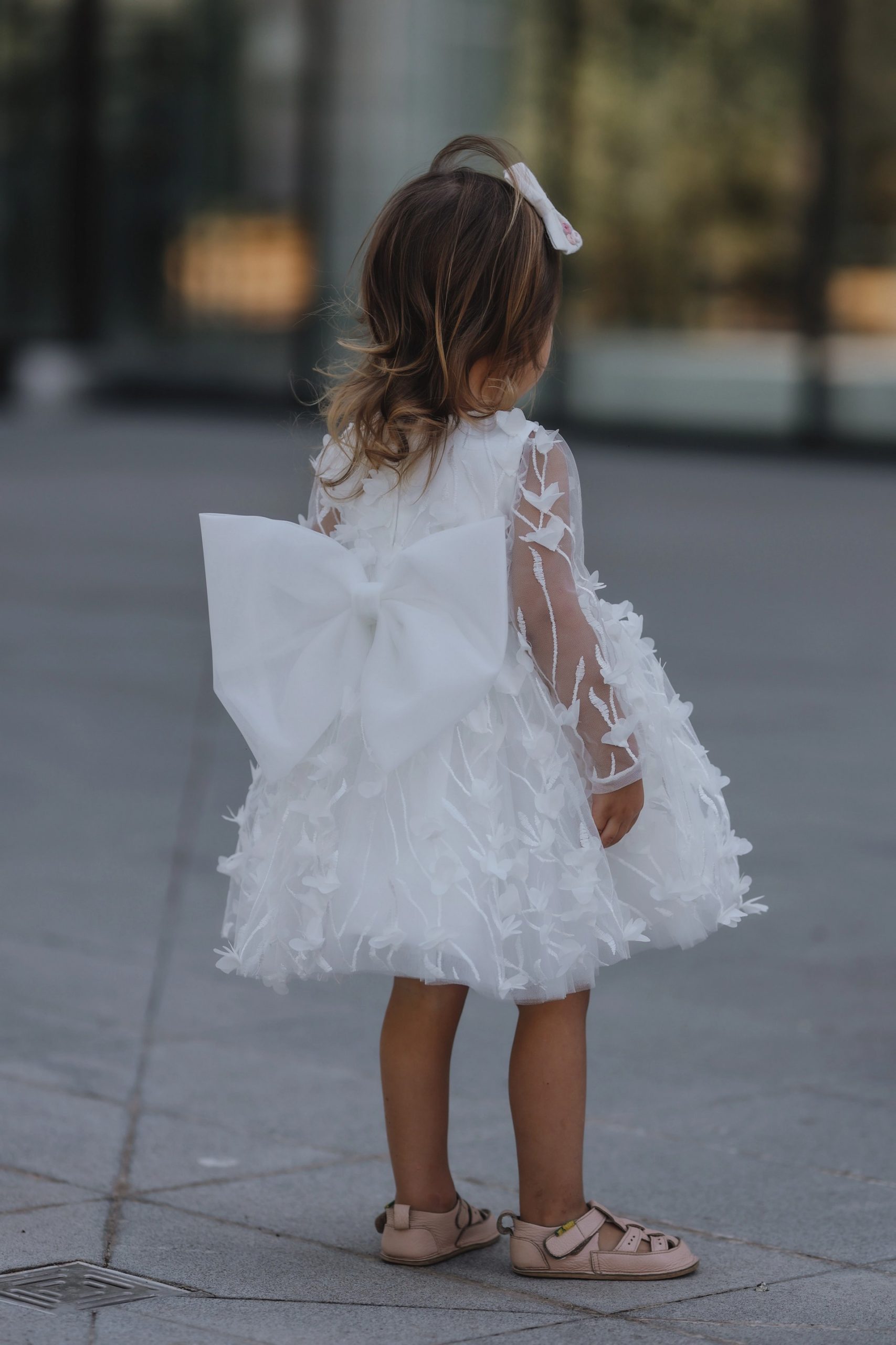 Izrađena je od delikatnog tila ukrašenog 3D cvjetnim aplikacijama koje joj daju romantičan i profinjen izgled. Prozirni rukavi dodatno naglašavaju njenu lakoću i eleganciju, dok slojevita suknja pruža volumen i stvara nježnu, lepršavu siluetu pri svakom pokretu. Velika mašna na leđima daje završni, luksuzni detalj koji ovu haljinicu čini posebno upečatljivom.