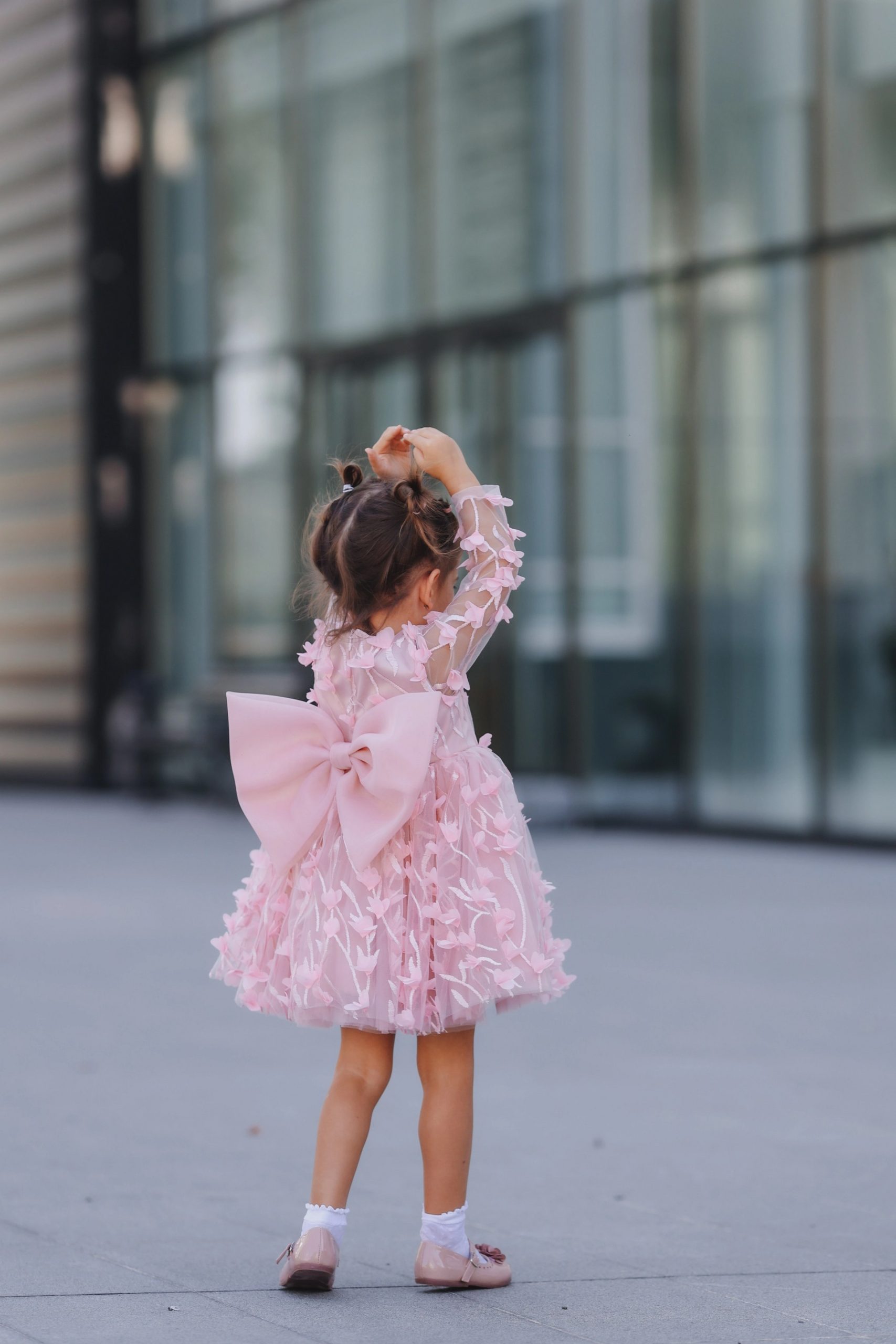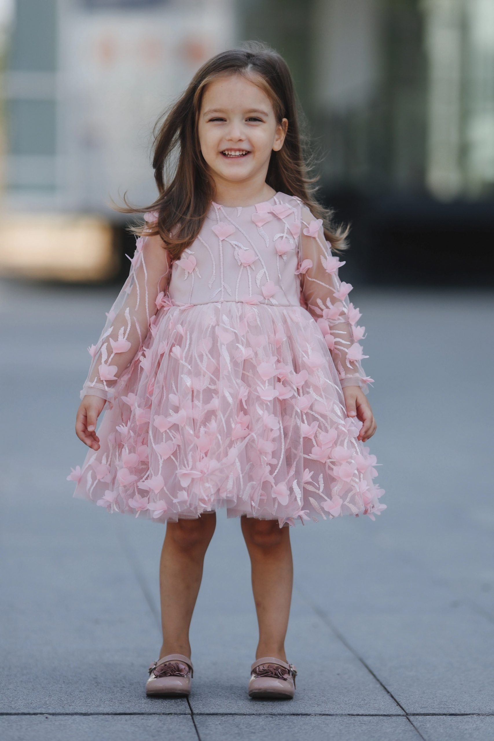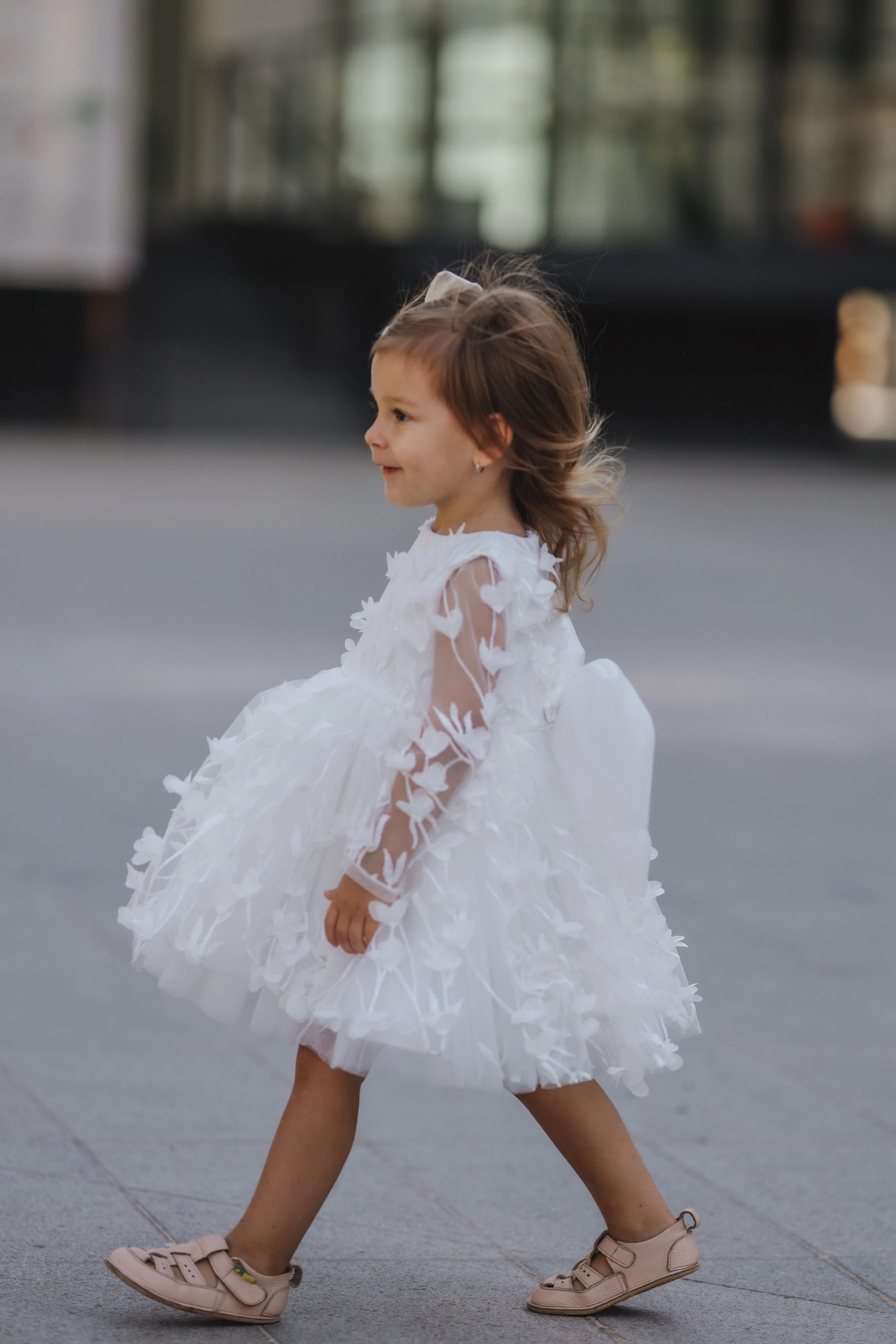 Izrađena je od delikatnog tila ukrašenog 3D cvjetnim aplikacijama koje joj daju romantičan i profinjen izgled. Prozirni rukavi dodatno naglašavaju njenu lakoću i eleganciju, dok slojevita suknja pruža volumen i stvara nježnu, lepršavu siluetu pri svakom pokretu. Velika mašna na leđima daje završni, luksuzni detalj koji ovu haljinicu čini posebno upečatljivom.