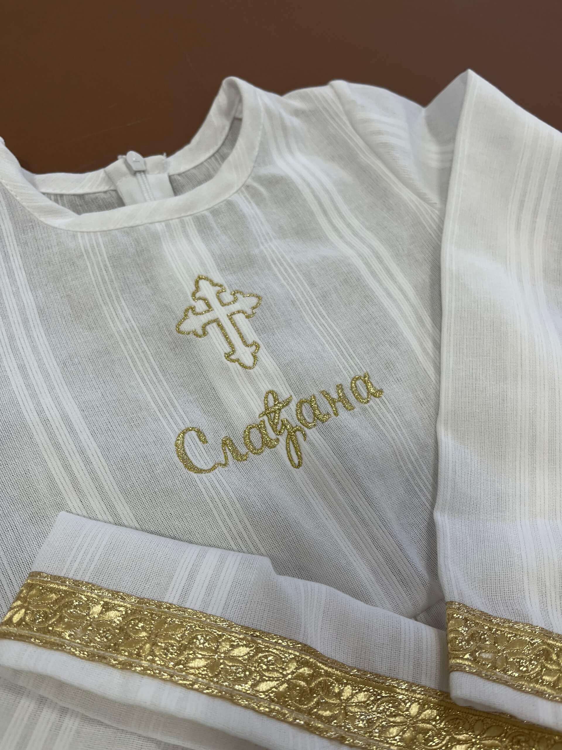 Haljinu je moguće personalizovati imenom djevojčice, čime postaje jedinstvena i trajna uspomena na veliki dan. Ime vezemo po vašoj želji, na ćirilici ili latinici, pažljivo i precizno, kako bi haljina bila savršena do posljednjeg detalja. Personalizovana haljina za krštenje nije samo svečana odjeća – ona postaje dio porodične priče i fotografija koje se čuvaju godinama.